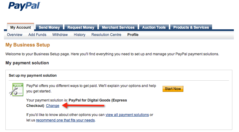 On the My Business Setup page, in the first box titled Set up my payment solution click Change and choose PayPal for Digital Goods (Express Checkout). Your account is now ready to accept Digital Goods with Express Checkout payments via PayPal.